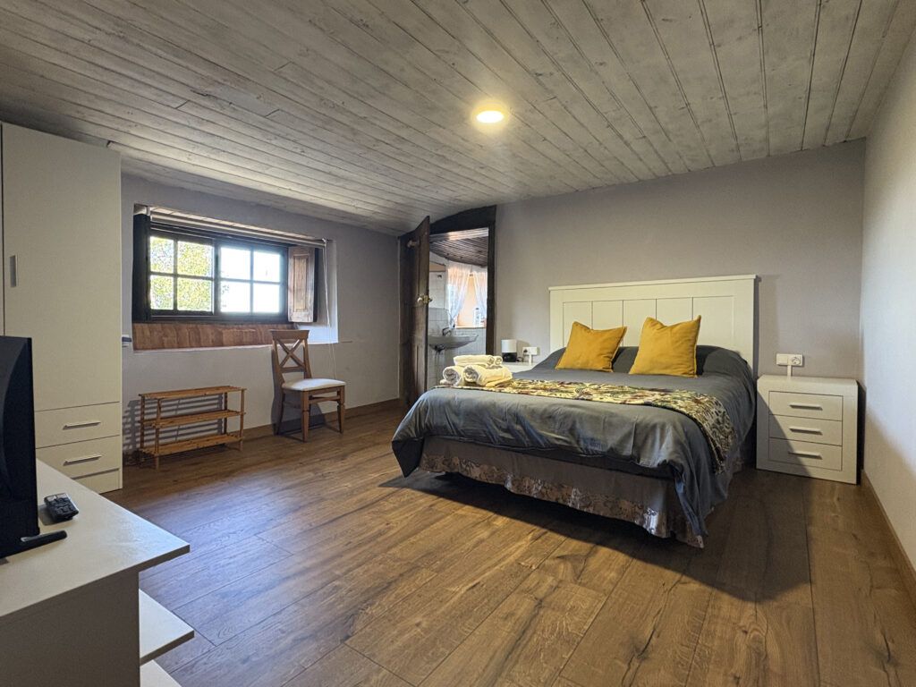 Habitación con baño, cama de 150 cm con espacio para otra plegable de 90 cm, televisión, armario y mesa para ordenador, litografía de proceso de la miel.